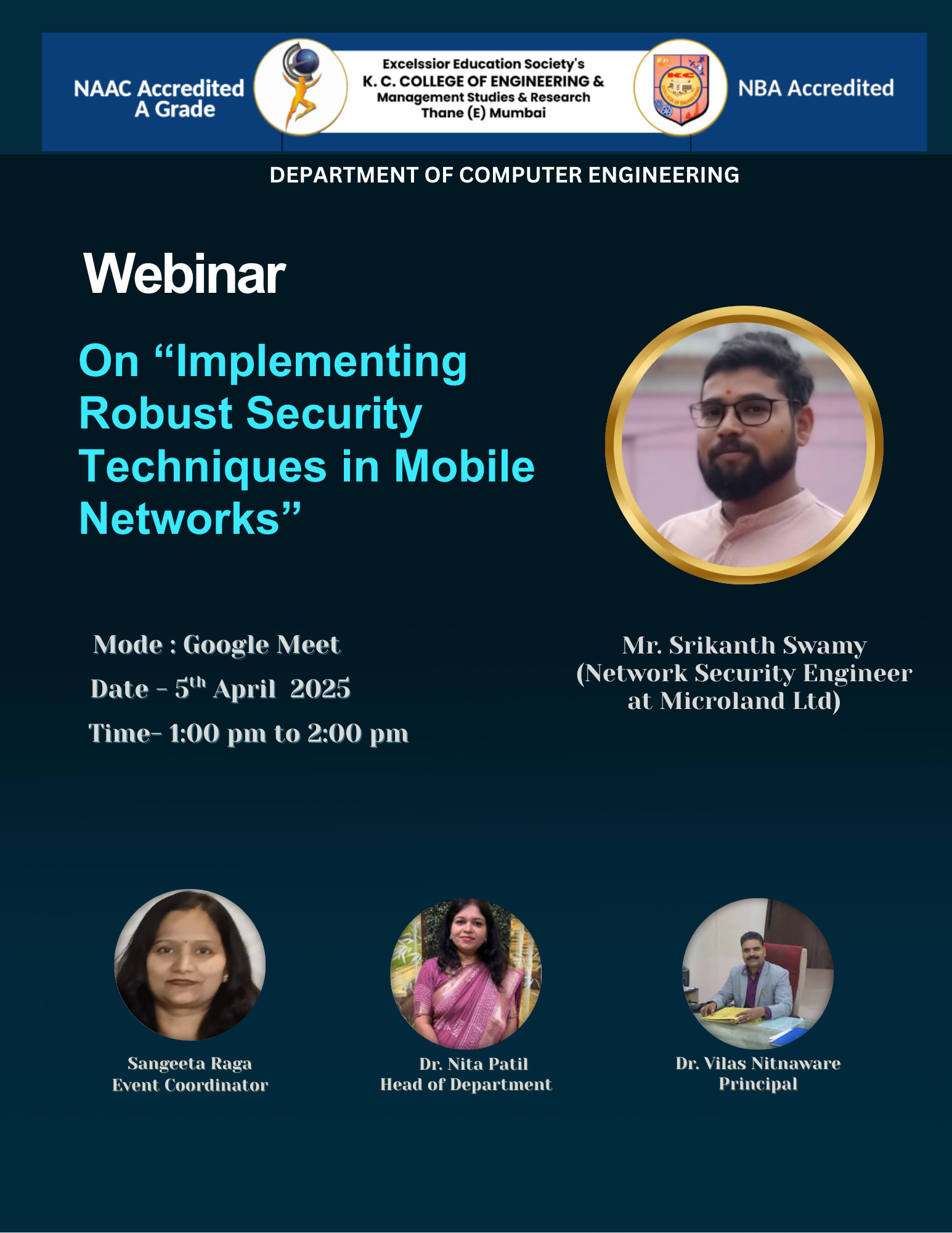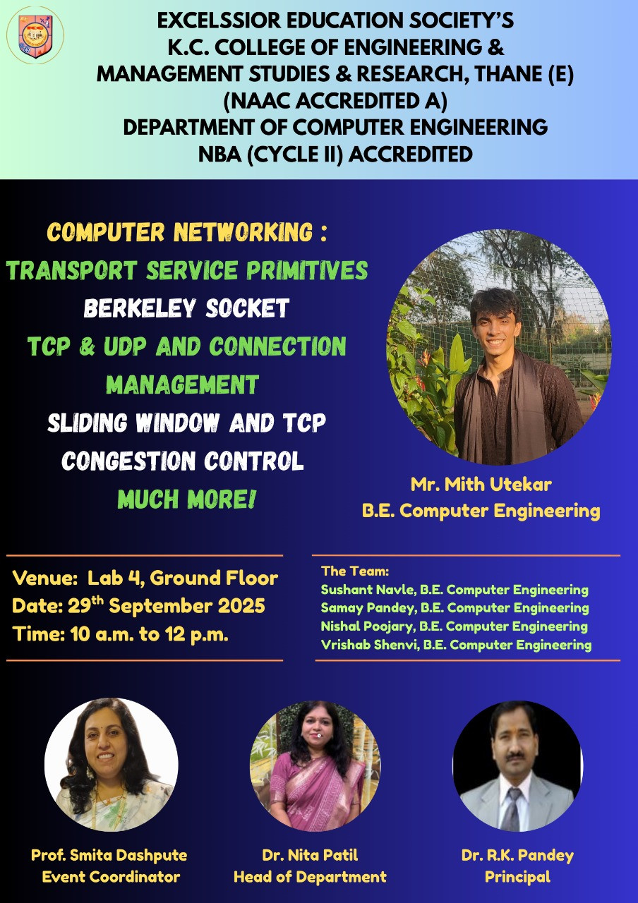 Welcome to the Department of Computer Engineering at K C College of Engineering & Management Studies & Research. We started our journey in the year 2001 and it’s been more than a decade that we have grown & nurture our expertise in the core Computer Engineering curriculum. We believe in providing high standards of education for the students. With the pace of today’s technology throughout the world the department offers excellent knowledge, state of the art facilities & resources in the form of well qualified faculties, constantly upgraded well equipped & fully furnished laboratories. Besides giving a comprehensive training in basic science and engineering subjects, the courses in Computer Engineering lays better importance on deep understanding of fundamental principles and state of the art knowledge about Computer Architecture, Programming Languages, Operating System , Networking Our Department believes in student oriented approach and aims at establishing a platform for continuing learning that is required for maintaining competency to solve new problems as they arise and face the world outside. With the right blend of knowledge & technology, the department endows students with the ability to apply knowledge of science & technology to work effectively in multidisciplinary teams, provide leadership & technical expertise. Along with the academic knowledge, various skill developments & teaching learning process of our faculties we ensure that the students will have a bright future as engineers & will emerge as an asset not only to this institution and to the organization they belong, but also to the country at large. Thank you for visiting us. Best wishes. Prof Dr. Nita Patil Head of Department (Computer Engineering)