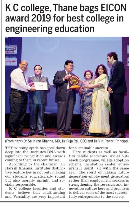 KCCEMSR received Mid Day Award for Excellence in Engineering and Management Education 2018.