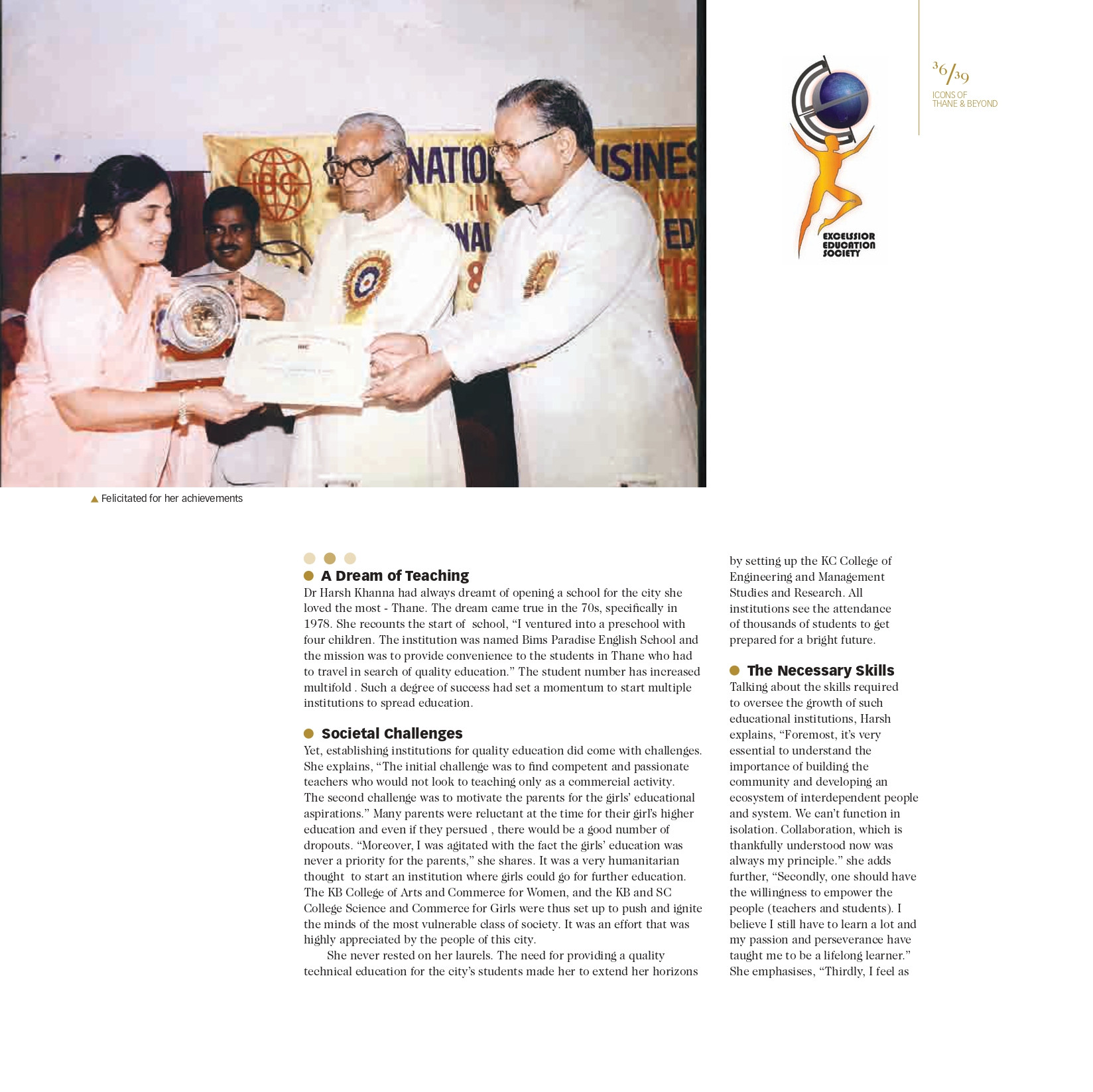 The chairperson of K. C. College of Engineering and Management Studies and Research, Dr. Harssh Khanna Ma'am felicitated with Icon of Thane and Beyond.