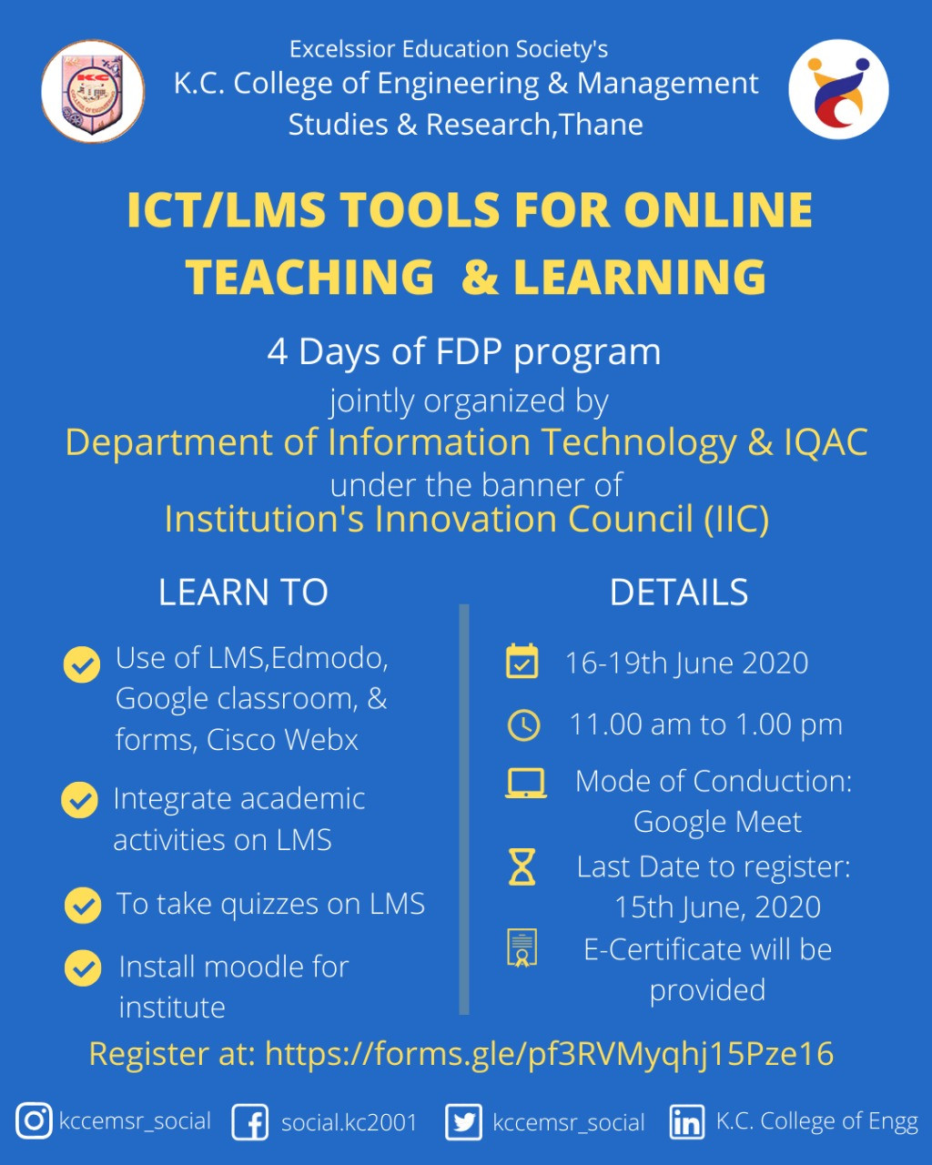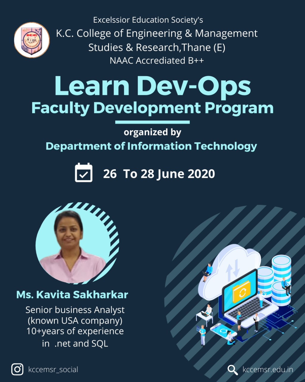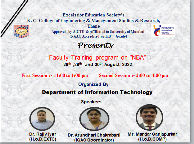 Welcome to Department of Information Technology at K. C. College of Engineering and management studies and Research, Thane. Our department is dedicated to ensuring great careers for its students. For us, this means forging deeper industry linkages than ever before, creating a research culture from day one and ensuring seamless education using the best technology. As you find your way through our website I would like to inform you that department consists of faculty, staff and students committed to excellence and success. Department offers Bachelor’ Degree in Information Technology under University of Mumbai. The Department also takes initiative to improve the soft skills, analytical capabilities and verbal communication of the students so that they can face the competition in the corporate world confidently. The Department has a team of highly experienced and motivated faculty members who are in the process of tuning the young minds to make them globally competitive. Innovative methods of teaching and learning process are adopted to achieve learning abilities through practice, exposure and motivation. Department has an excellent infrastructural and computing facilities and provides a conducive environment to promote academic and research excellence in the department. Above all, the entire teaching fraternity of the Department of Information Technology look forward to the holistic growth of the department and they aim at doing something extraordinarily remarkable in the academic arena of Information Technology. I congratulate to the team of faculty members and the students for their brilliant and original efforts. I wish all the Students and Faculty a great academic career.
