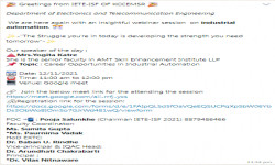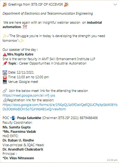 Career Opportunities in Industrial Automation” on behalf of the Department of Electronics and Telecommunication, IETE-ISF of Excelsior Education Society’s K.C. College of Engineering and Management Studies and Research was organized for all the students of EXTC for enhancing their job prospects and opportunities in the area of Automation. She gave the overall view about the areas of automation where our students fit in and what all skills are required for the same