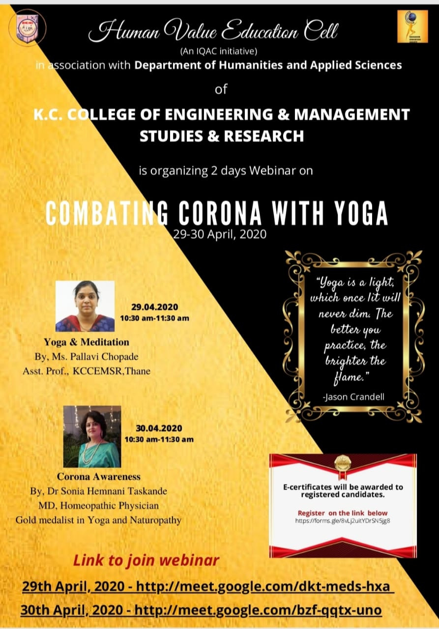 KCCEMSR organized two days webinar on "Combating Corona with Yoga" By Mrs. Pallavi Chopade and Dr. Sonia Hemnani,MD Homeopathic physician, Gold medalist in Yoga.