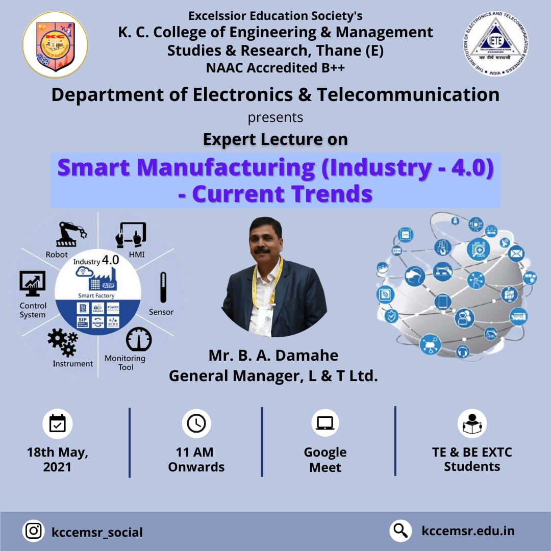 Department of Electronics and Telecommunication Engineering presented expert lecture on Expert lecture on Smart Manufacturing (Industry-4.0) - Current Trends on 18th May 2021.