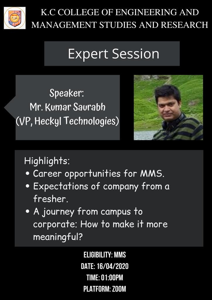 A guest session for MMS students was conducted by Mr. Saurabh Kumar, Vice President of Heckly Technology. The session was attended by 37 participants. The session covered various career opportunities across industries, the importance of aligning personal strengths with career choices, and the evolving demands of the job market. Students were also guided on building effective resumes, preparing for interviews, and developing essential skills for career advancement.