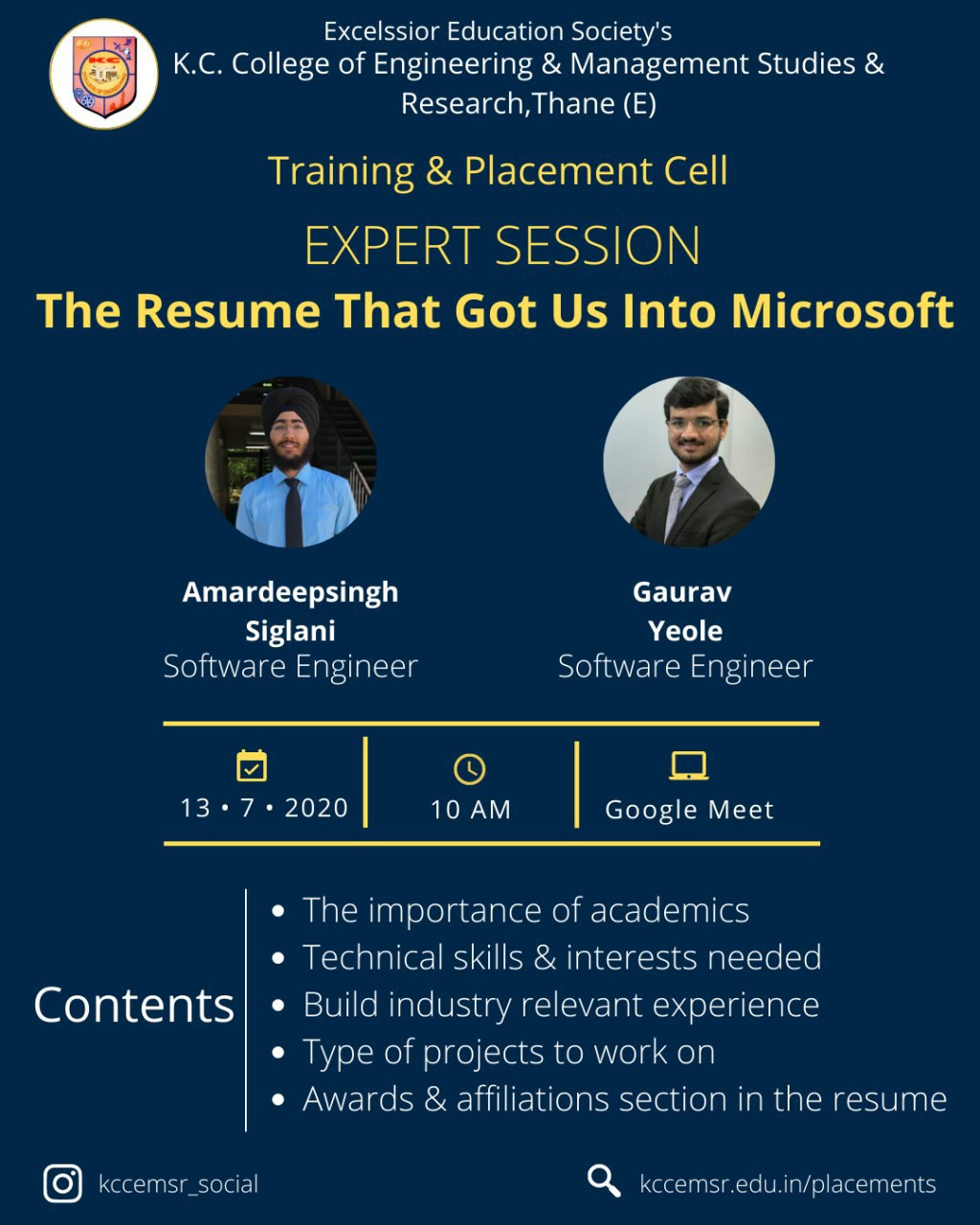 The Training and Placement Cell of KCCEMSR organized Expert Session on The Resume That Got us into Microsoft by Mr. Amardeepsingh Siglani and Mr. Gaurav Yeole.