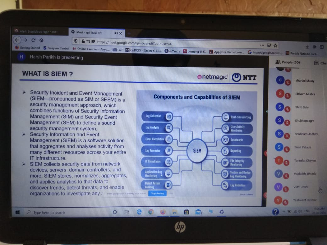 A guest lecture organized by Computer department on "SIEM architecture and its working" By Mr. Harsh Parikh.