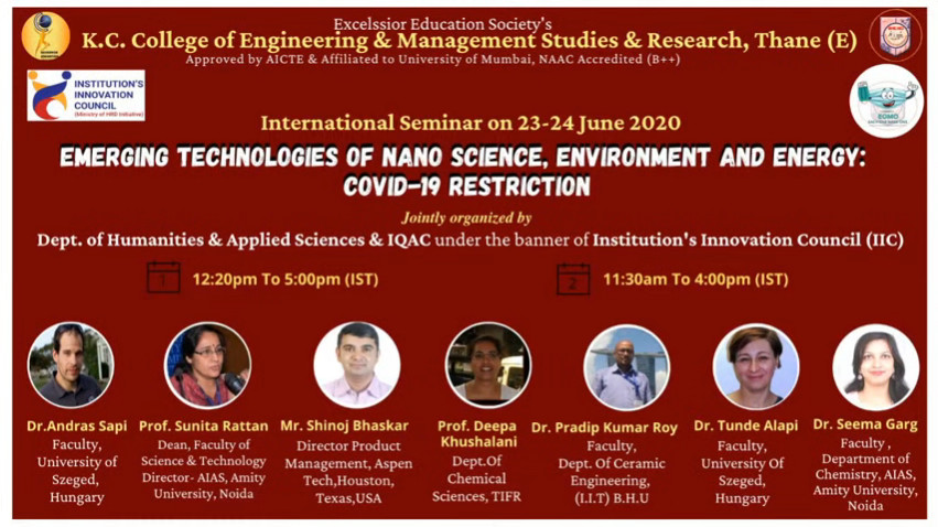 The department of Humanities and Applied Sciences in association with IQAC under the banner of Institution's Innovation Council (IIC) is going to organize an INTERNATIONAL SEMINAR ON EMERGING TECHNOLOGIES OF NANO SCIENCE, ENVIRONMENT AND ENERGY: COVID-19 RESTRICTION on 23 June, 2020 and 24 June, 2020.