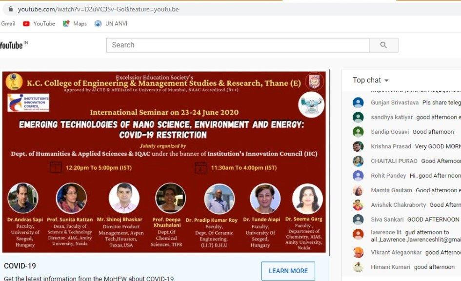 As a part of activity in the COVID-19 pandemic situation, Department of Humanties and Applied Sciences of K.C.College of Engineering and Management studies and Research organized two days International Seminar on Emerging Technologies of Nano Science, Environment and Energy: COVID-19 RESTRICTION* on 23 June, 2020 and 24 June, 2020 using You tube platform. The idea behind this was to guide the upcoming researchers and spread the knowledge in Nano science field.