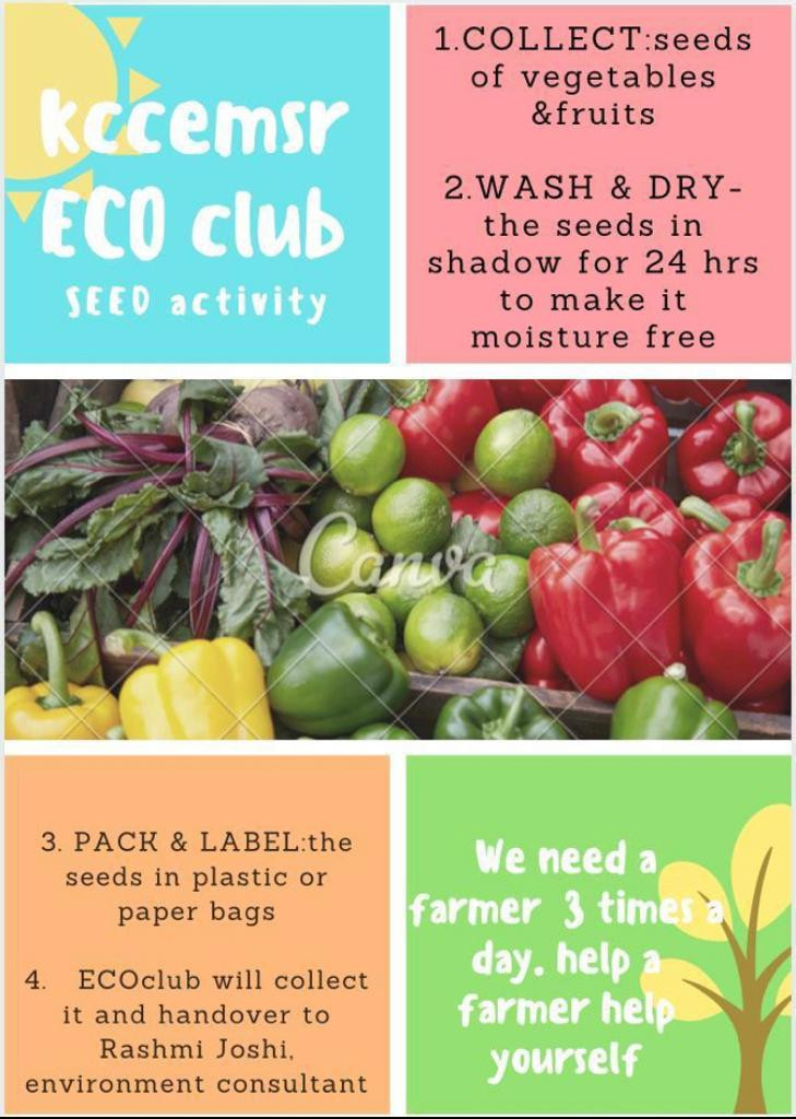 KCCEMSR organized seed activity where Eco club will collect the seeds of vegetables and fruits and handover to Ms. Rashmi Joshi, Environment Consultant.