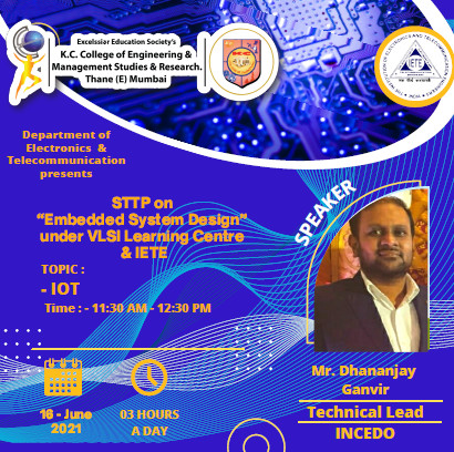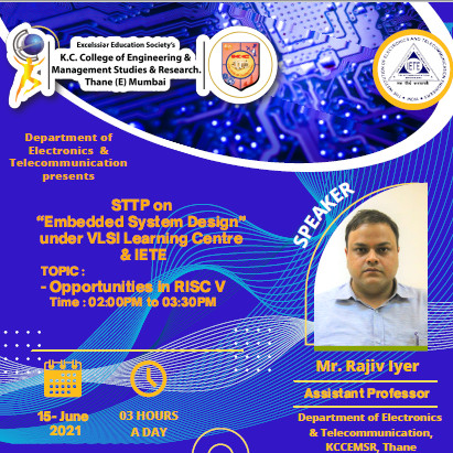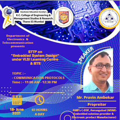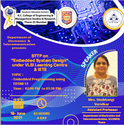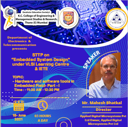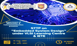 Department of Electronics and Telecommunication organized 6 days of Online STTP on Embedded System Design under VLSI Learning Centre and IETE to enlighten on research, new technologies trends, and opportunities in the field of ESD. Sessions were covered with 8 eminent and versatile speakers, from Industry and Academia, who are experts in their respective fields with outstanding experience in Embedded System Design. There were around 300 registrations from all over India.