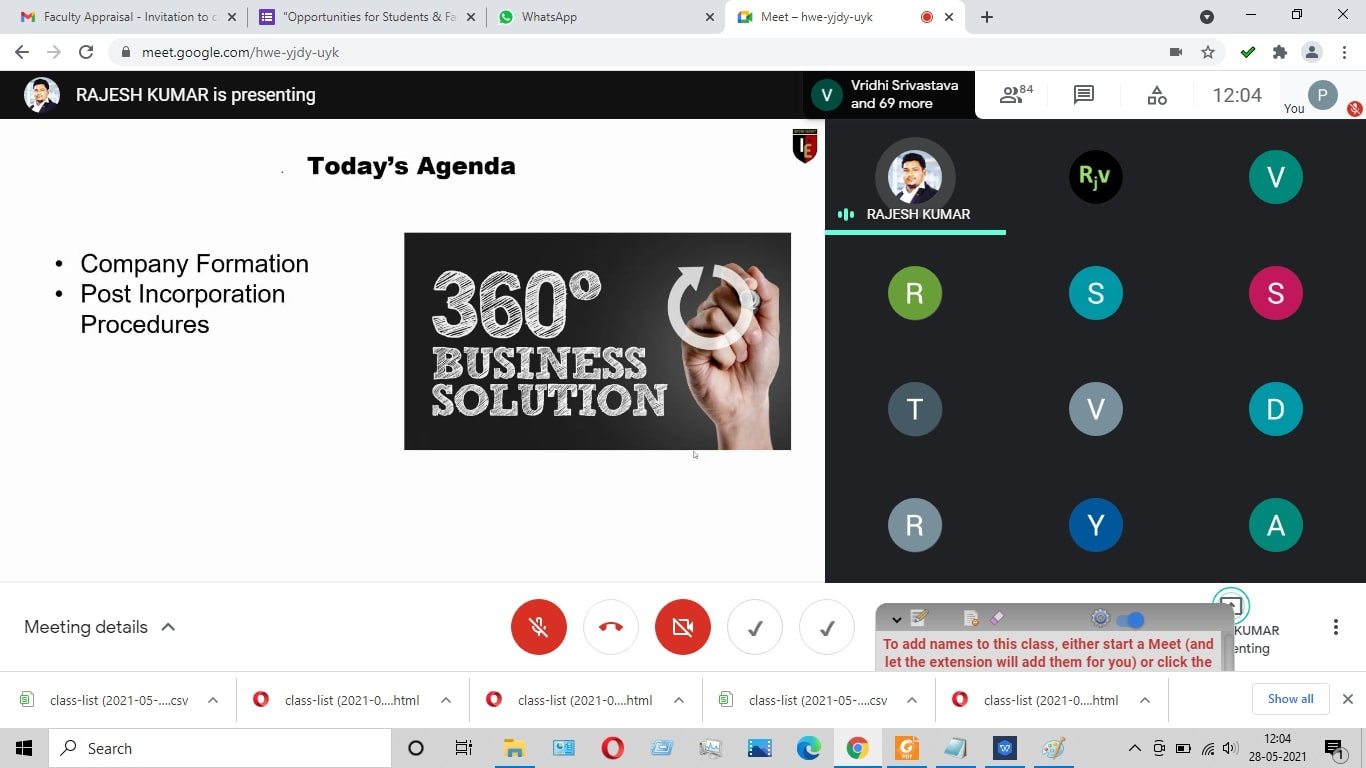 2. The event covered the following topics: Entrepreneurship, Start-ups and company formation, types of companies and registration process, motivational talk for Entrepreneurship.