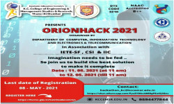 The objective of Hackathon is to have Team building, Networking. Intense problem-solving which facilitate the creation of innovative ideas and concepts and Talent Acquisition where the students can go beyond their reach and see how much talent and concept is needed to make one project successful. Keeping this view in mind the Department of Electronics and Telecommunication, Computer Engineering and Information Technology of K.C. College of Engineering & Management Studies & Research under the banner of IETE- SF, CSI & IIC Organised Orion Hack-2021 National level online Hackathon It was a 24 hours event that started at 11 A.M on 11-May-2021 and ended at 11 A.M on 12-May-2021. From all over India, the responses received total 22 teams registered for the event. The participants had enrolled from various states like Maharashtra Andhra Pradesh, Haryana, Rajasthan and Telangana making the Hackathon a success.