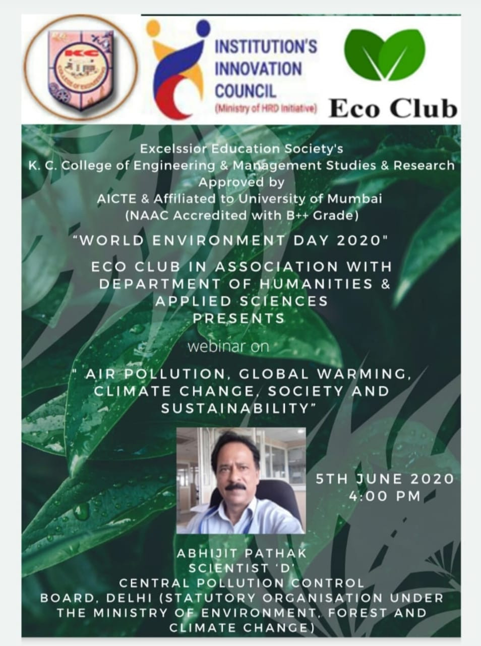 Eco Club in association with Department of Humanity and Applied Sciences organized Webinar on Air Pollution, Global Warming, Climate Change, Society and Sustainability by Mr. Abhijit Pathak.