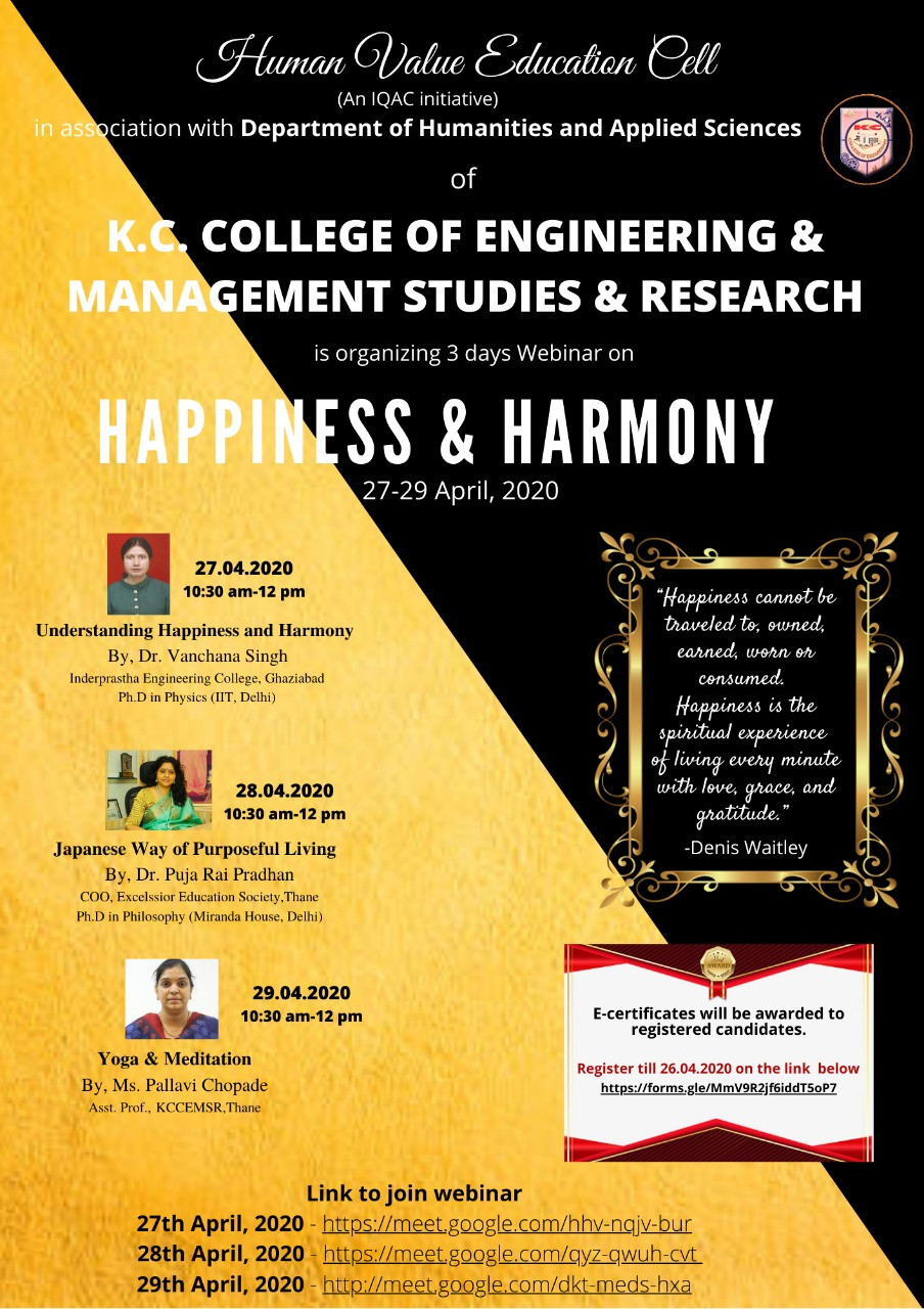 KCCEMSR organized three days webinar on "Happiness and harmony" By Dr. Sonia Hemnani,MD Homeopathic physician, Gold medalist in Yoga,Dr Puja Rai Cheif Operating Officer,Ass.Prof Pallavi Chopde